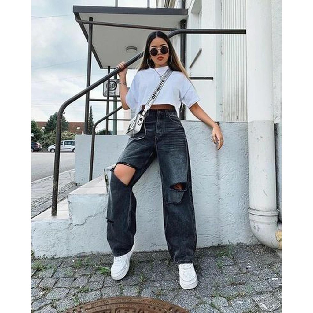 Women 2021 Korean Wide Leg Jeans Fashion Solid Color Irregular Ripped Hole High Waist Straight Denim Pants Shopee Singapore